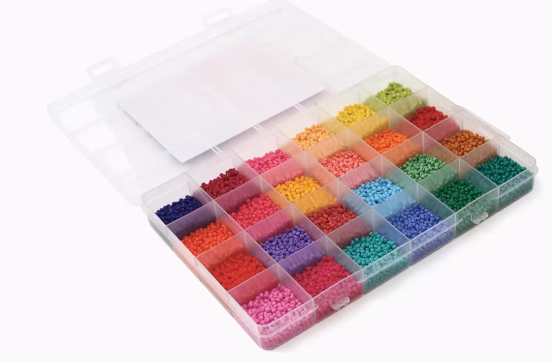 Boxen innehåller 24 färger av seed-beads i storlek 2mm med 7g av varje färg.