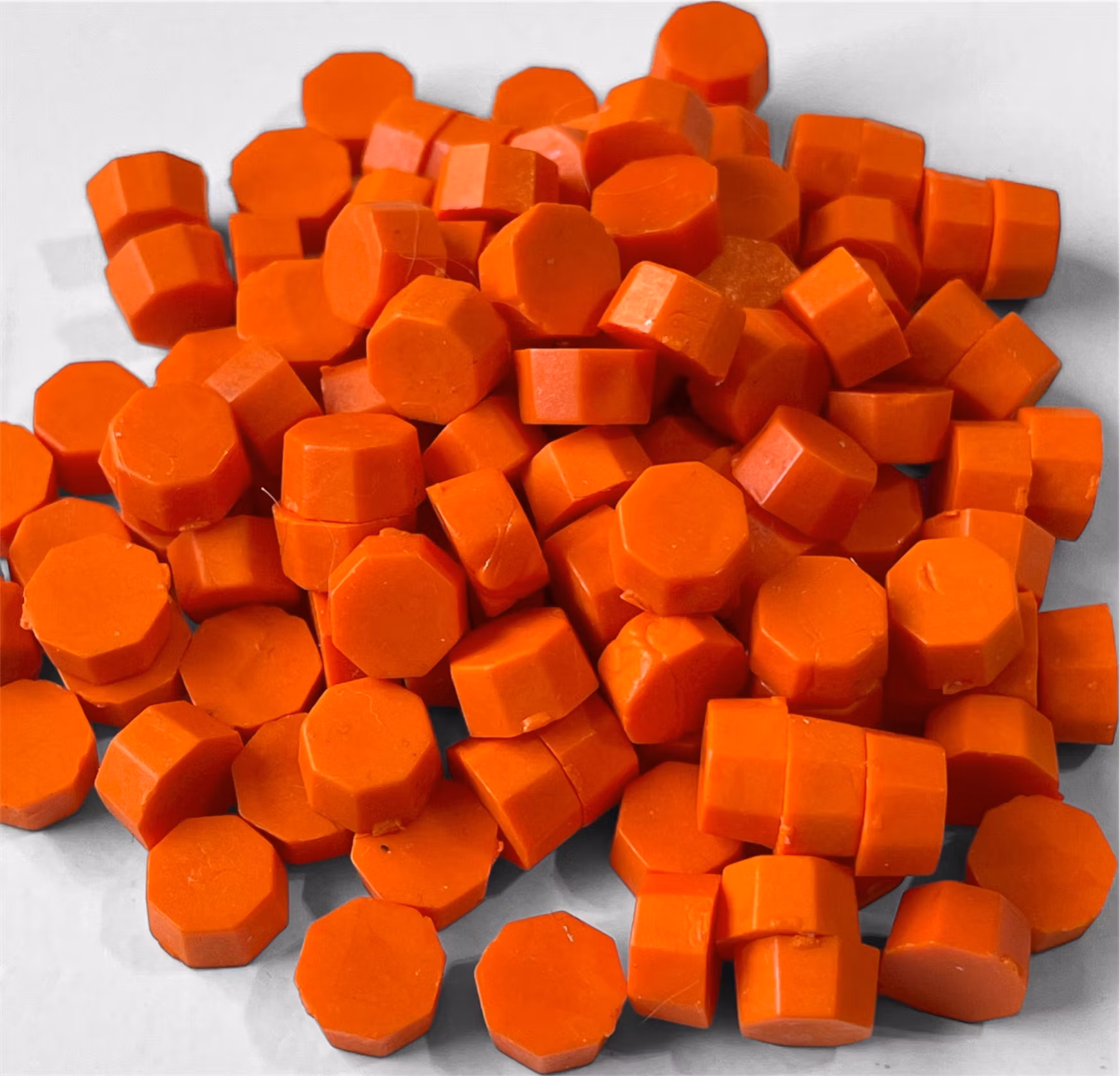 Vaxpärlor till att göra sigiller med. Smält 3-4 st (räcker för ett sigill) i exempelvis en vaxsmältningsspis med tillhörande sked över ett värmeljus.